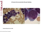 A 34-year-old man presented with gum bleeding. His complete blood count revealed hemoglobin, 10 g/dL; red blood cells, 3.8 × 1012/L; hematocrit, 34%; white blood cells, 64 × 109/L; and platelets, 12 × 109/L. The peripheral blood smear showed numerous blasts, small to medium in size with finely granular, basophilic cytoplasm and an occasional Auer rod; however, multiple Auer rods were noted on the top of the nucleus of a single blast (panels A-B). The chromatin pattern in the nuclei appeared to be dispersed with the presence of multiple nucleoli. A provisional diagnosis of acute promyelocytic leukemia (APL) was made on morphology alone with the clinician being immediately informed. Reverse transcription–polymerase chain reaction on the following day confirmed the presence of t(15;17)(q22;q12);PML-RARA consistent with APL. APL is a medical emergency, with disseminated intravascular coagulation and severe thrombocytopenia being its most common manifestations. A strong suspicion on the peripheral blood smear significantly reduces the diagnostic lag time crucial for timely intervention. Multiple Auer rods, the morphologic hallmark of APL, may not always be evident in the cytoplasm, being left stranded on the top of the nuclei like in this case. Thus, hematopathologists should always look for Auer rods on the top.